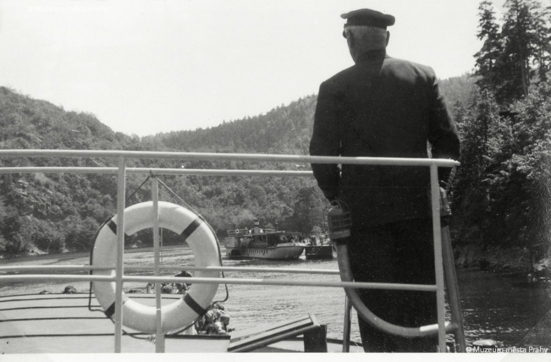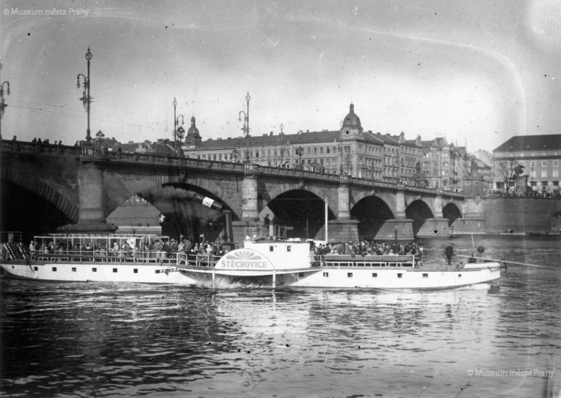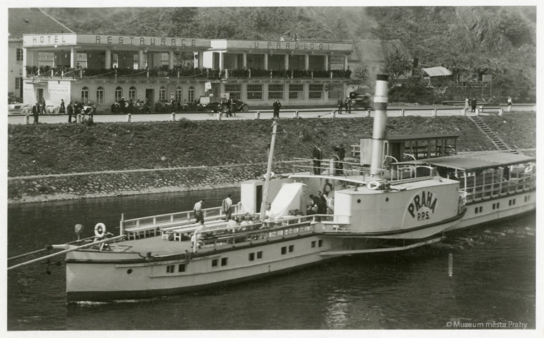 Parník Štěchovice „Pražské paroplavební společnosti" vyráží z Prahy do Štěchovic. Vyroben byl r. 1891 jako Ferdinand I. Dobrotivý, dosloužil v r. 1936. Snímek od Palackého mostu z konce 20. let 20. stol. Foto Národní politika. Negativ, MMP H 007 057; Parník Praha v kotvišti před restauraci „U parolodi" ve Štěchovicích koncem 30. let 20. stol. Vyroben byl v r. 1887 jako František Josef I., dosloužil v r. 1974. Restaurace s funkcionalistickou nástavbou poskytovala návštěvníkům nejen občerstvení, ale také zajímavý pohled na Vltavu s přístavištěm parníků. V současnosti je mimo provoz. Pohlednice, MMP H 216 653.