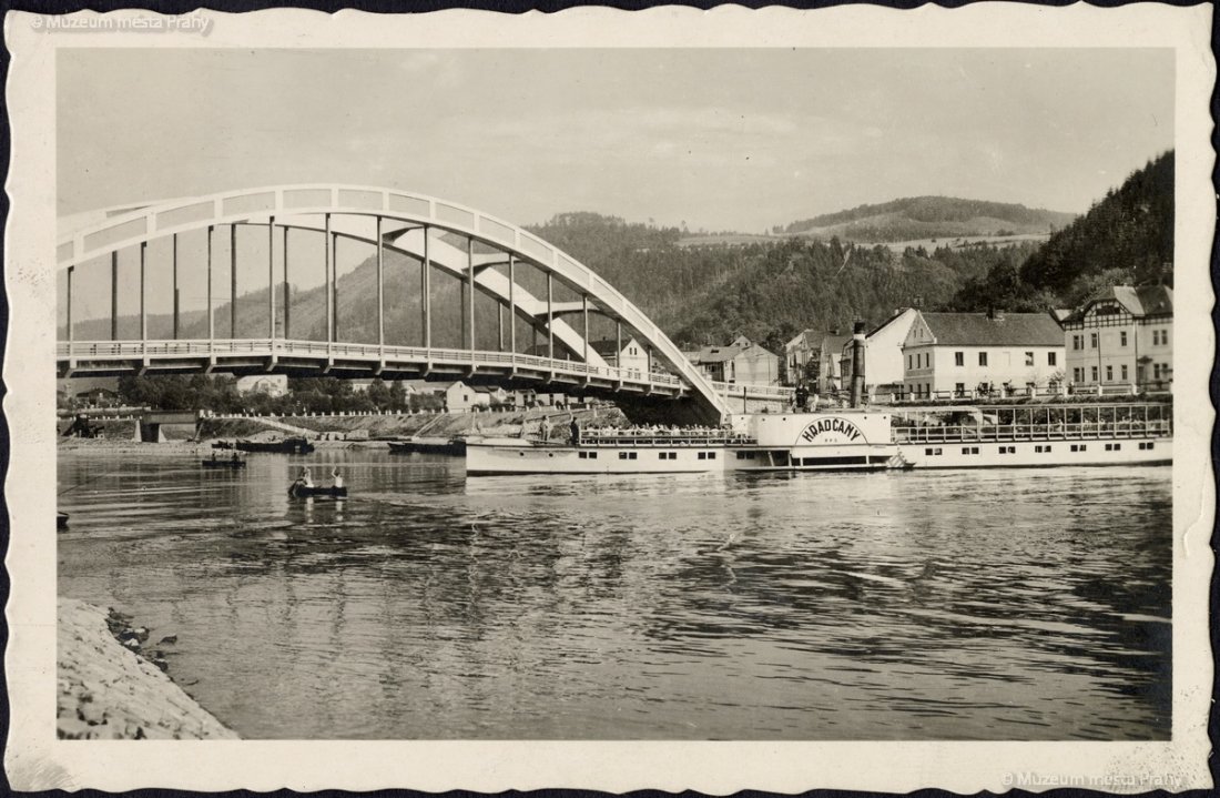 Parník Hradčany u nového mostu ve Štěchovicích v r. 1939. Vyroben byl r. 1880 jako František Josef. Most byl otevřen 30. 5. 1939 a po válce pojmenován po Dr. Edvardu Benešovi. Jeho mostovka je zavěšena na dvou dutých betonových obloucích. Pohlednice, MMP H 216 833.