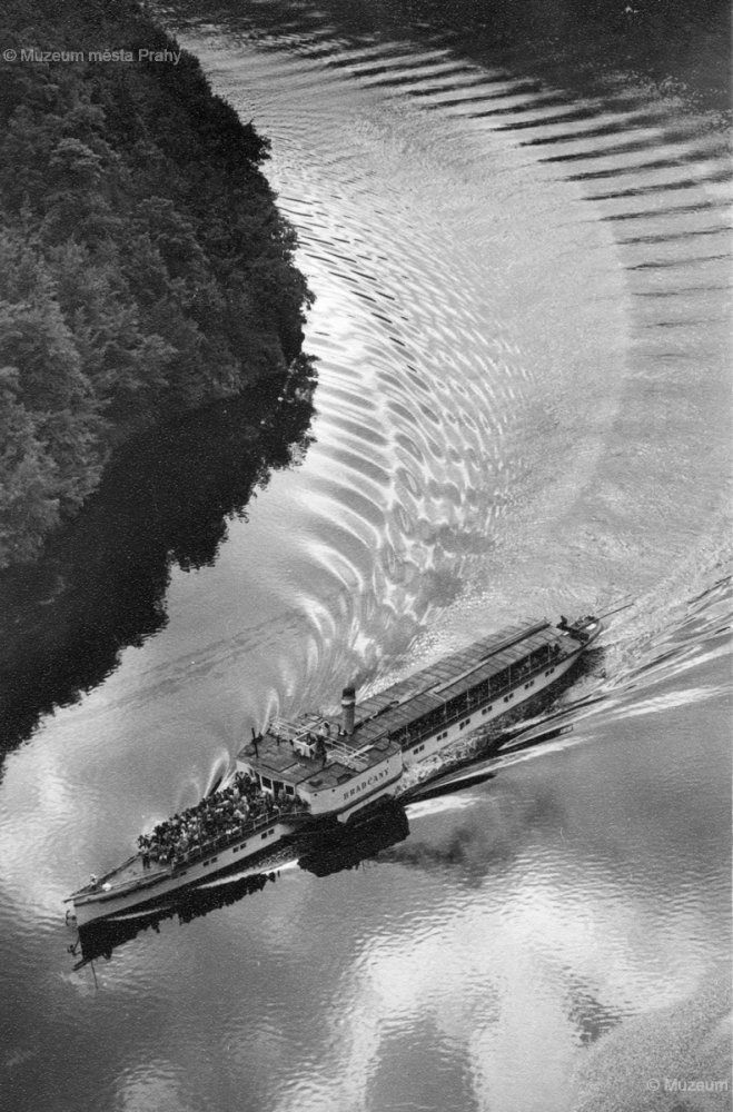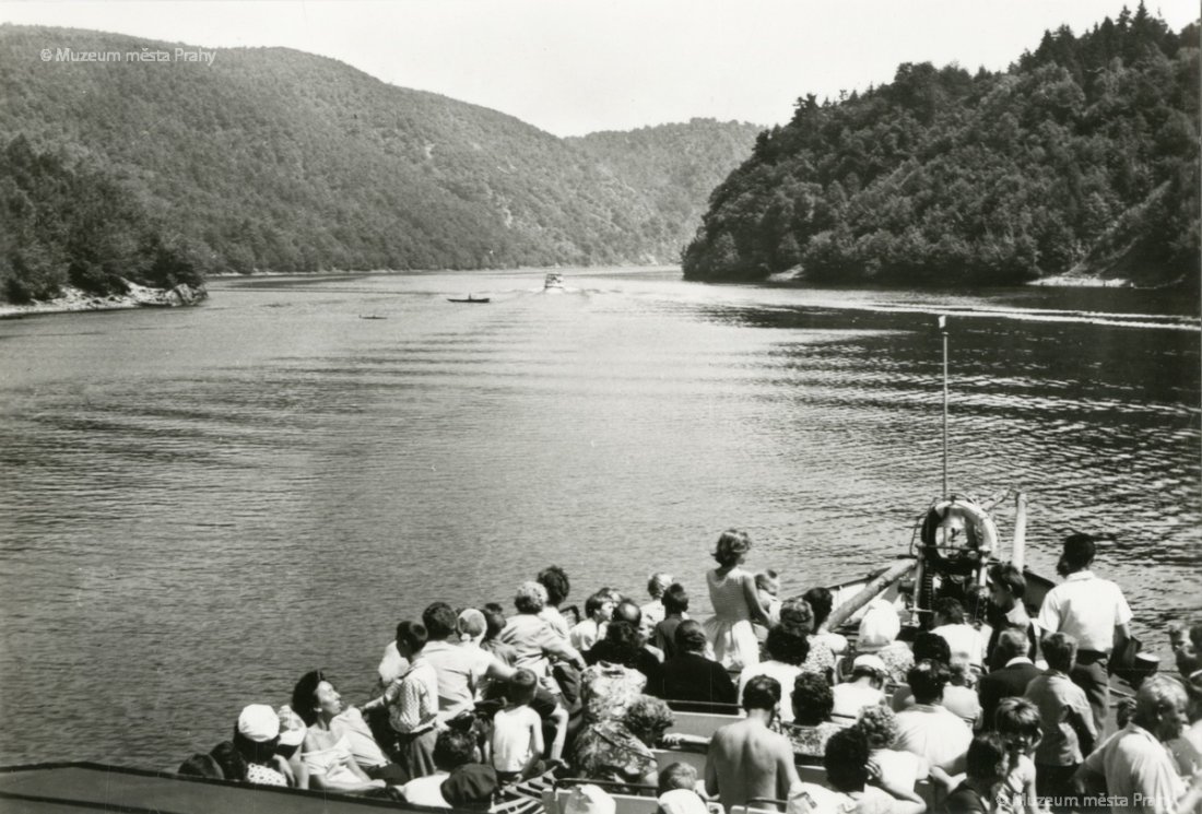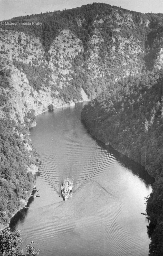 Pohled do údolí Vltavy, již po zatopení Svatojánských proudů. V pozadí vrch Máj. Na hladině jeden z pražských parníků, kterým se vrací výletníci. 50. léta 20. stol. Fotografie, MMP H 216 005.