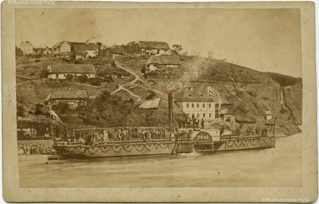 První parník PRAG-PRAHA připlul do Štěchovic z pražského Podskalí dne 26. 8. 1865. Toto datum je pokládáno za počátek pražské osobní lodní dopravy. Cesta proti proudu trvala 4 hodiny a 3 minuty, cesta zpět 2 hodiny a 3 minuty. Fotografie, foto Jindřich Eckert. MMP H 050 304.