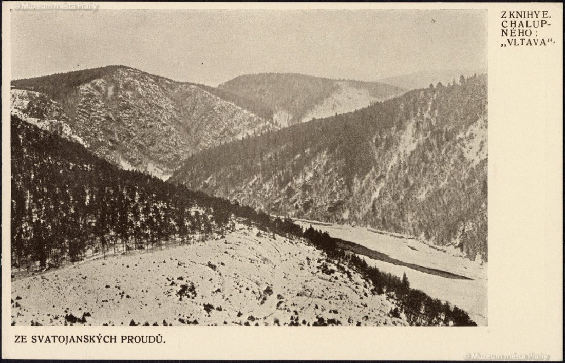 Drsná „severská" krása Svatojánských proudů v zimě upomínala na aljašské či kanadské řeky. Cesta kolem řeky v Proudech bývala v zimě zcela neprůchodná pro nakupené ledové kry. Reklamní pohlednice na knihu Emanuel Chalupného „Vltava", která vyšla poprvé r. 1914. Pohlednice, H MMP 216 859.