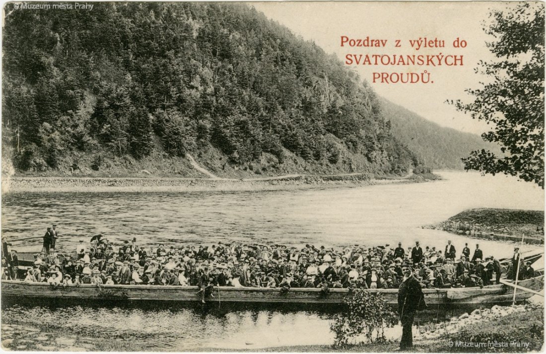 Dvě pramice s výletníky do Svatojánských proudů z pražských parníků jsou připraveny k odplutí u Horního slapu. V pozadí je vidět potahová stezka, které zde šla po pravém břehu Vltavy. Pohlednice odeslaná 7. 6. 1909. Fotografoval A. F. Wanner, Štěchovice n. Vlt. MMP H 216 990.