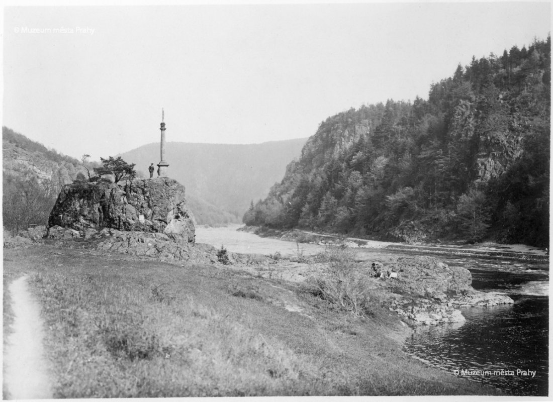 Skála Sedlo s Ferdinandovým sloupem a pohled od Horního slapu Svatojánských proudů do údolí Vltavy směrem po proudu. Fotografie z r. 1915, autor neznámý.