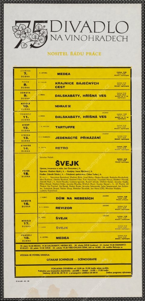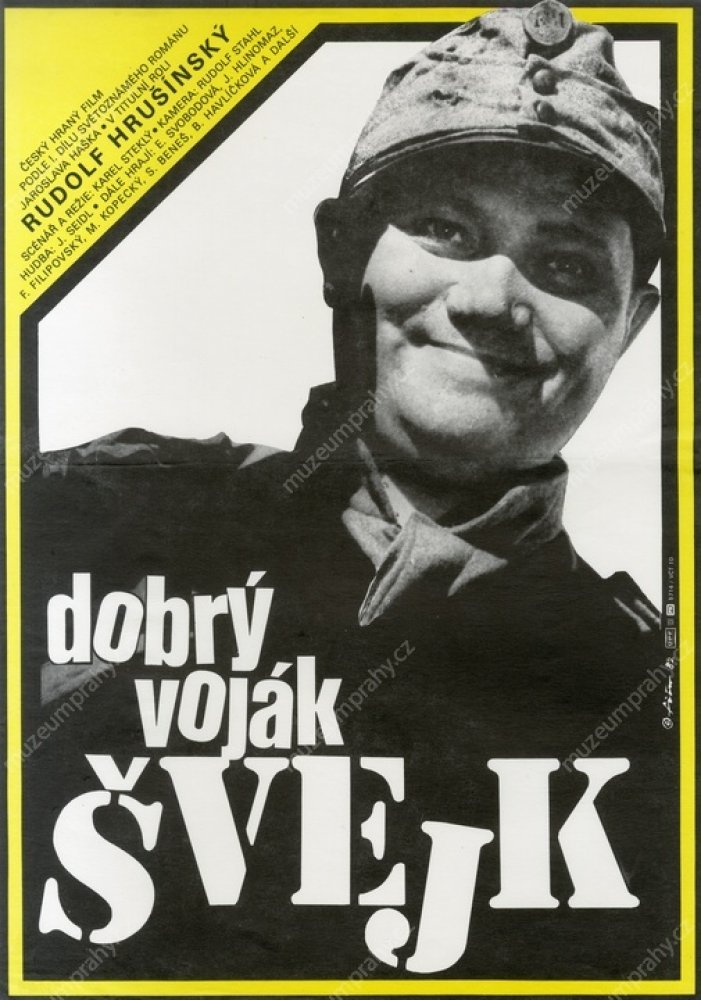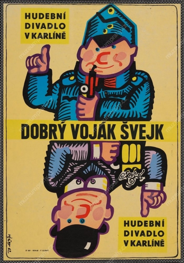 Plakát k československému filmu Dobrý voják Švejk, režie Karel Steklý, autor plakátu Jaroslav Fišer, 1982, MMP H 281 169; Půlměsíční programový plakát Divadla na Vinohradech s divadelní hrou Švejk, režie Jan Grossman, 7.–18. dubna 1983, MMP H 213 083.