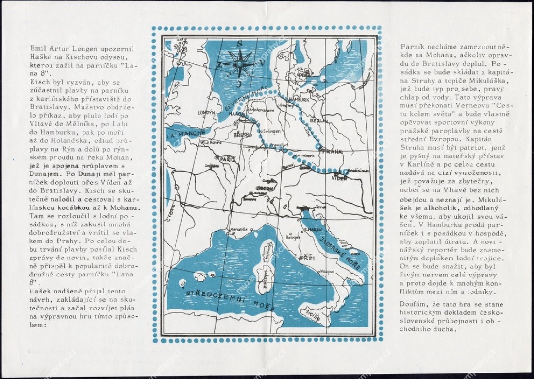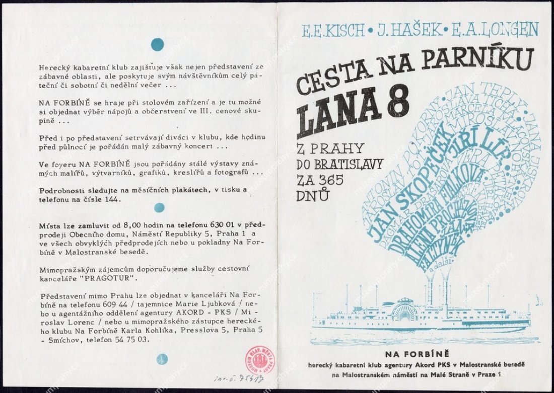 Program komediálního představení Cesta na parníku LANA 8 z Prahy do Bratislavy za 365 dnů od autorů E. E. Kische, Jaroslava Haška a E. A. Longena provedené Hereckým kabaretním klubem Na Forbíně, červen 1970, MMP H 75 417.