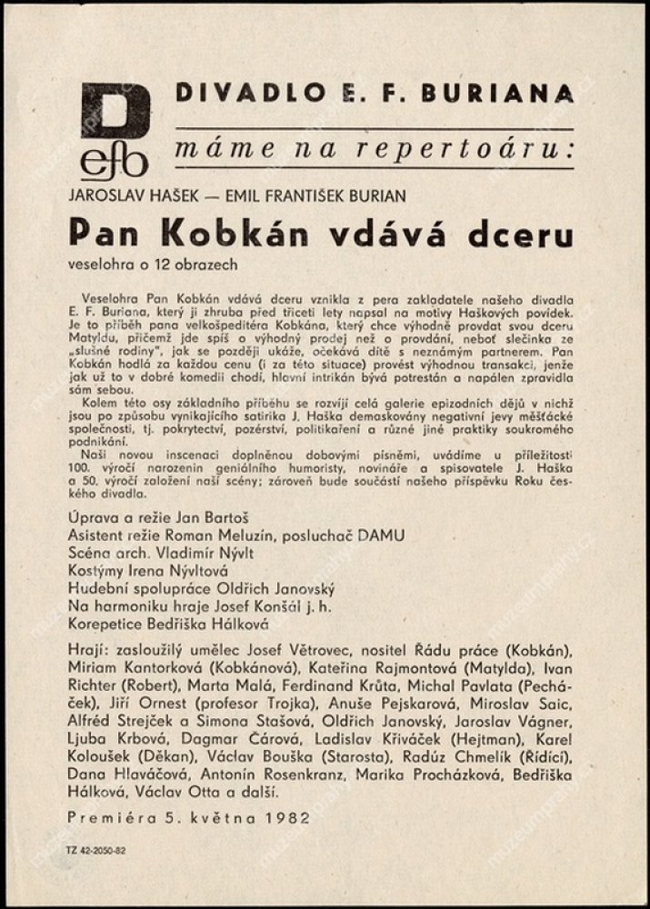 Program k divadlení hře hře Pan Kobkán vdává dceru, autoři Jaroslav Hašek, E. F. Burian, Divadlo E. F. Buriana, premiéra 5. května 1982, MMP H 126 417.