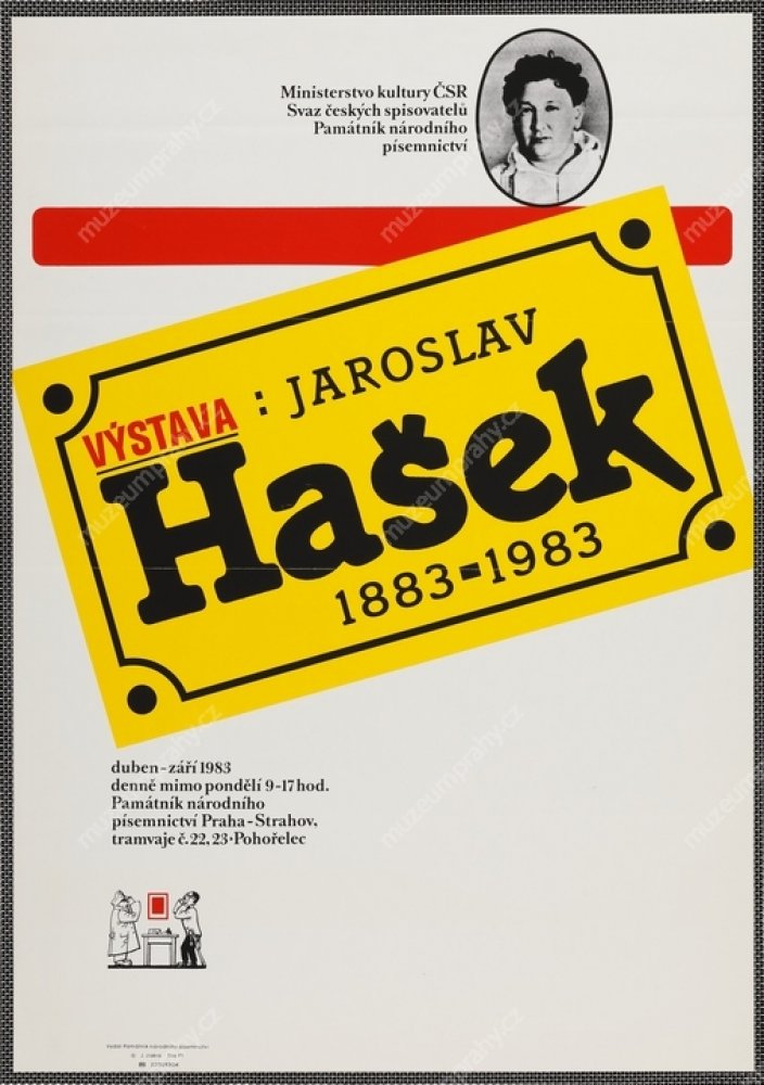 Plakát k výstavě Jaroslav Hašek 1883–1983, Památník národního písemnictví, duben–září 1983, autor plakátu Jan Jiskra, MMP H 317 946.