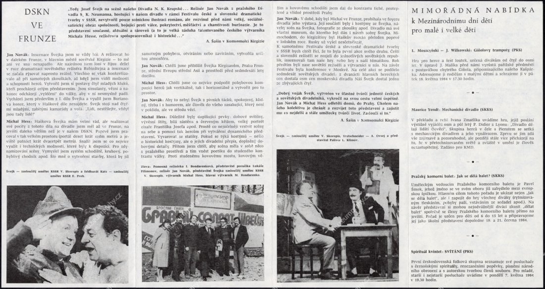 Divadelní program Divadla S. K. Neumanna na měsíce květen–červen 1984, uvnitř programu zpráva o nastudování hry Josef Švejk, režie Jan Novák, Divadlo N. K. Krupské ve Frunze (dnes Biškek, Kyrgyzstán), MMP H 128 646.