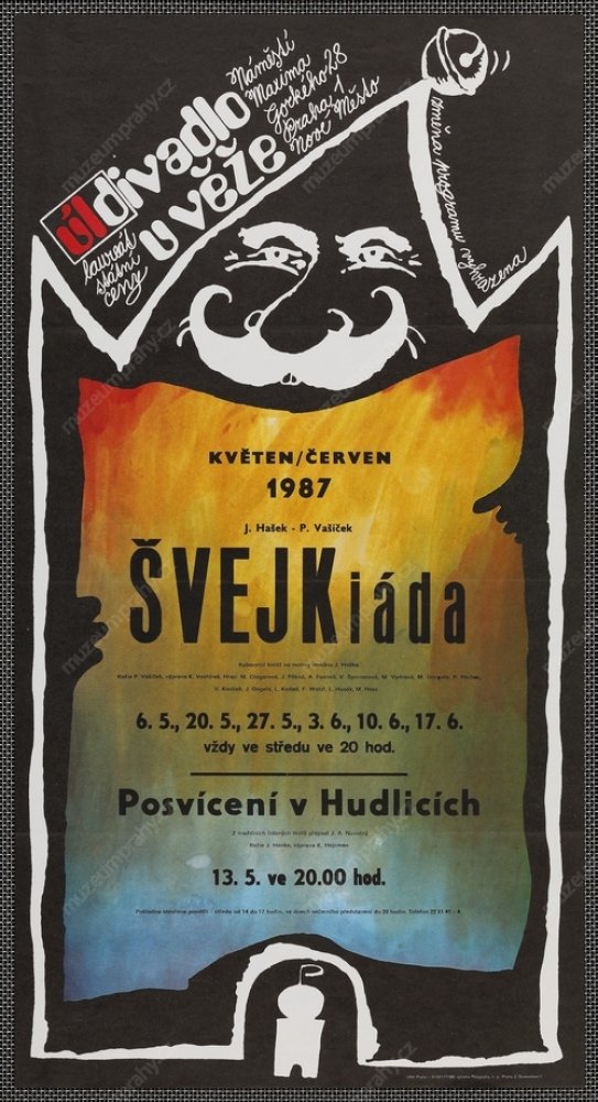 Plakát ke kabarietnímu představení Švejkiáda, režie P. Vašíček, Divadlo U věže, květen–červen 1987, MMP H 129 819; Program k divadelní hře Švejk scénického remaku filmu Dobrý voják Švejk z roku 1926, napsali Jaroslav Hašek, Tomáš Svoboda, David Jařab, Divadlo Komedie, premiéra 15. června 2004, foto plakátu Kateřina Štréblová, MMP H 278 346.