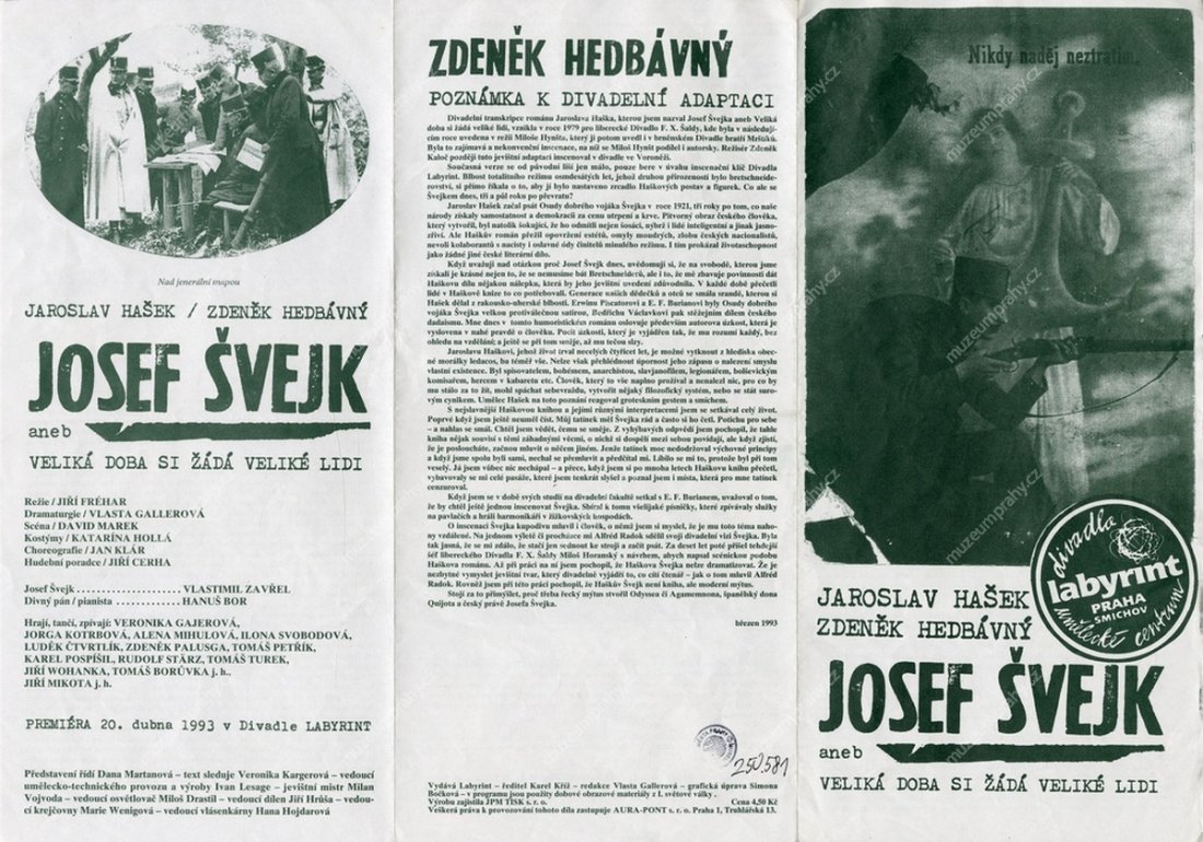Program k divadelní hře Josef Švejk – Jaroslav Hašek, Zdeněk Hedvábný, režie Jiří Fréhar, Divadlo Labyrint, premiéra 20. dubna 1993, MMP H 250 851.