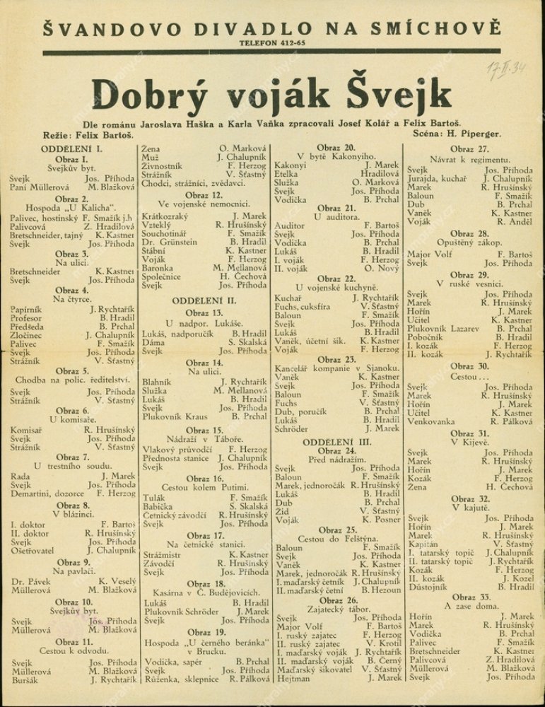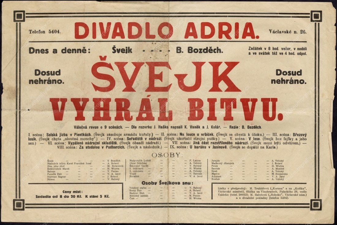 Program komedie Dobrý voják Švejk ve světové válce, v úpravě E. A. Longena, po roce 1920, Revoluční scéna Divadélka Adrie na Václavském náměstí, MMP H 75 117; Plakát k divadelní hře Švejk vyhrál bitvu, režie Bedřich Bozděch, 12. května 1923, Divadlo Adria, MMP H 134 311.
