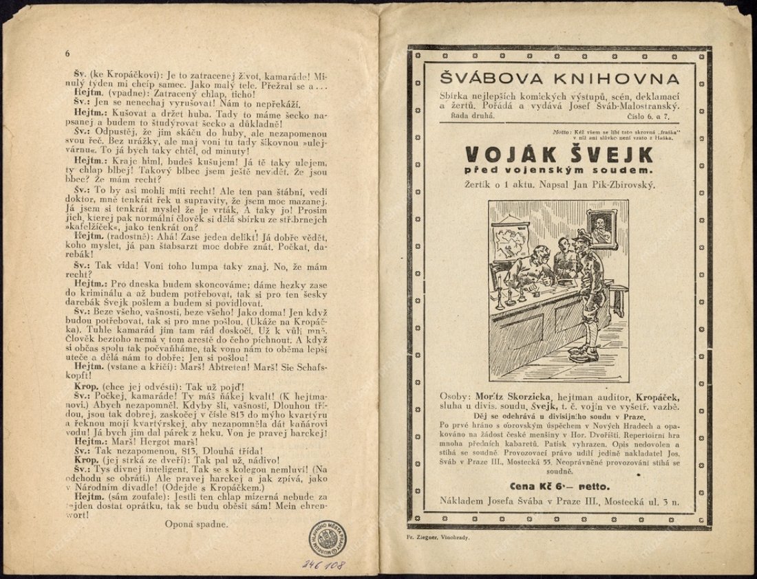 Libreto ke hře Voják Švejk poručíkem, podle hry J. L. Webera upravil Josef Šváb-Malostranský, kolem roku 1925, Švábova knihovna – Sbírka komických výstupů, scén, deklamací a žertů, MMP H 233 161; Libreto ke hře Voják Švejk před vojenským soudem, napsal Jan Pik-Zbirovský, kolem roku 1925, Švábova knihovna – Sbírka komických výstupů, scén, deklamací a žertů, MMP H 246 108.