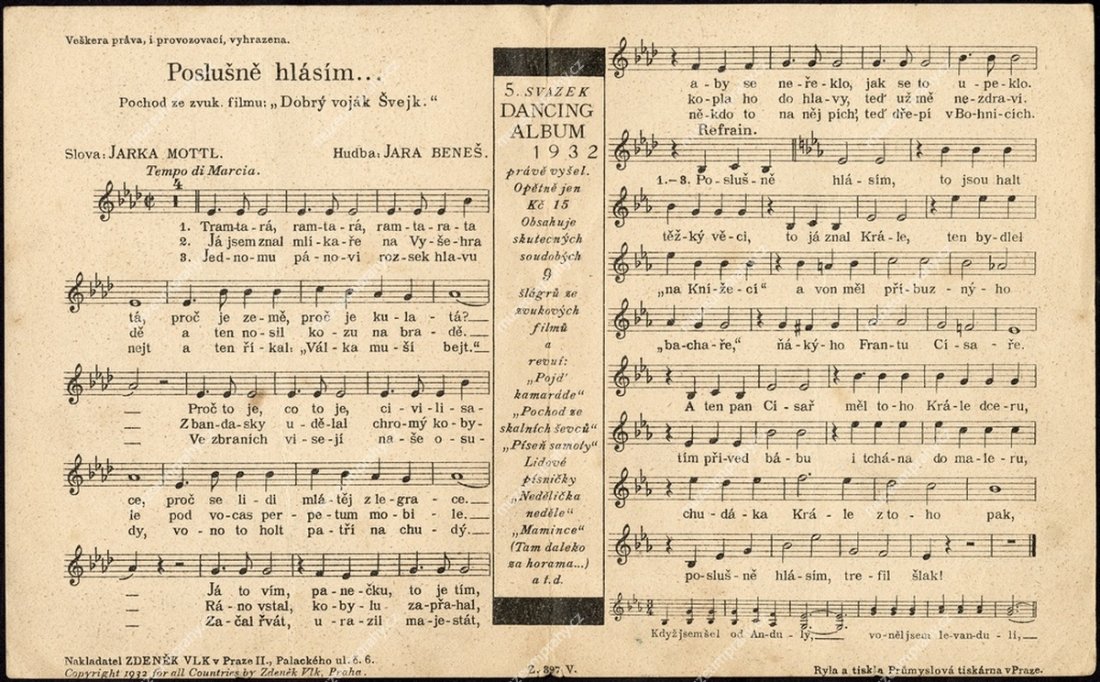 Píseň Poslušně hlásím z filmu Dobrý voják Švejk, hudba Jára Beneš, slova Jarka Mottl, Václav Špilar, Václav Mírovský, nakladatelství Zdeněk Vlk, Praha II, autor obálky Voborský, 1932, MMP H 296 938.