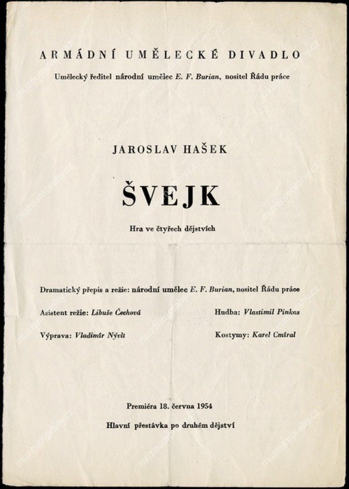 Plakát k představení Osudy dobrého vojáka Švejka, režie František Klika, Alhambra, 25. ledna 1954, MMP H 311 869.