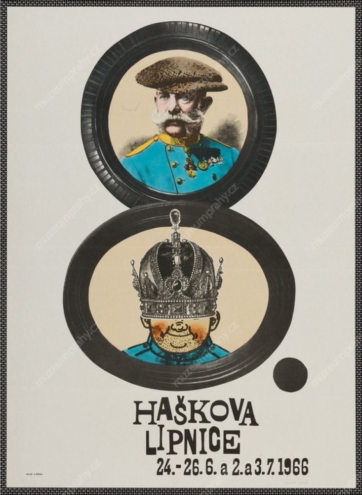 Plakát k představení Dobrý voják Švejk, Hudební divadlo v Karlíně, 1962, autor plakátu Miloslav Jágr, MMP H 64 017; Plakát k festivalu 8. Haškova Lipnice, 24.–26. června a 2.–3. července 1966, autor plakátu Bohumil Štěpán, MMP H 57 85.