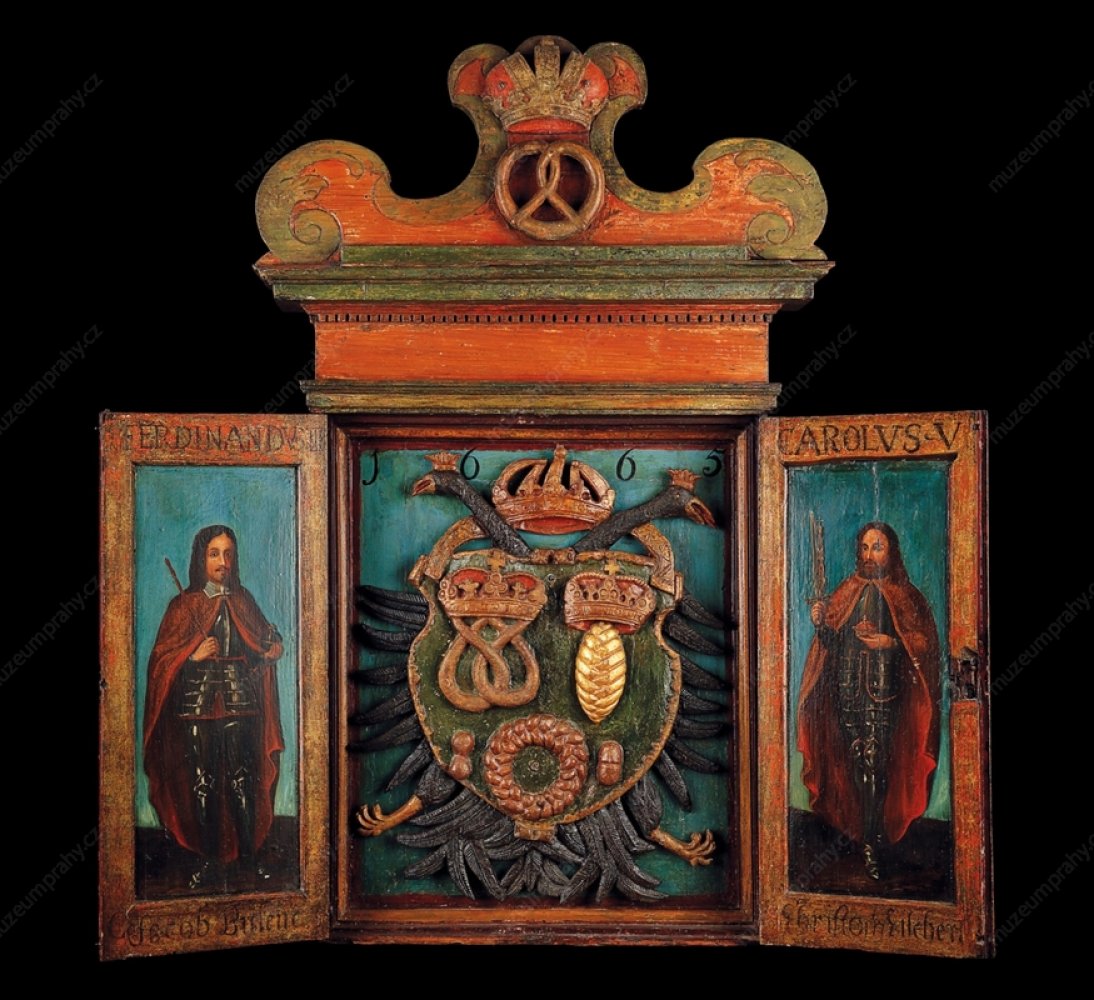 Vývěsní štít cechu pekařů Malé Strany, Praha 1665, obnoveno 1839, smrkové dřevo, řezba, polychromie, zlacení. V nástavci štítu korunovaný preclík, při rozevření dvířek uvnitř štítu rakouský orel se štítem s atributy pekařského řemesla: preclík, vánočka, žemle, pletený věnec, na vnitřních stranách dvířek figury Ferdinanda III. a Karla V., MMP H 034 503.