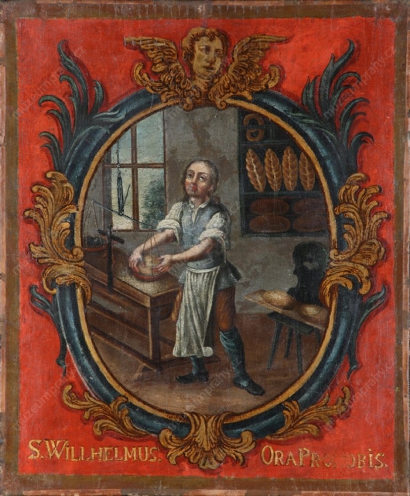 Pohřební štít cechu pekařů, Praha 1798, olej na plátně. Ve středové kartuši pohled do pekařské dílny s figurou sv. Viléma převažujícího bochník chleba, při spodním okraji štítu nápis: S. Willhelmus. Ora pro nobis, MMP H 003 592.